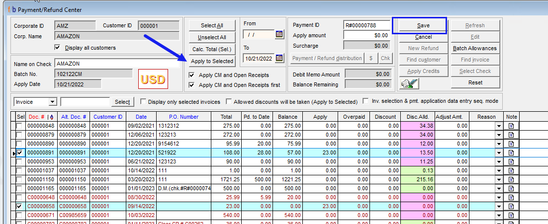 5. The user has the option to select the Credit Memo by checking the box on the left and then selecting the box to the left of the corresponding invoice if the entire Credit Memo will be applied to the Invoice. The user then selects the 'Apply to Selected' Button to apply the Credit Memo to the Invoice and selects 'Save' when complete.