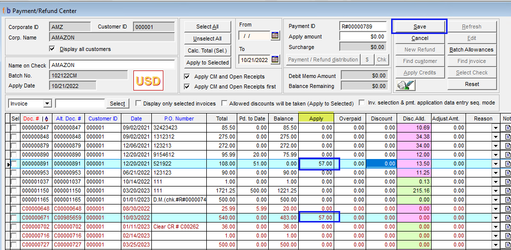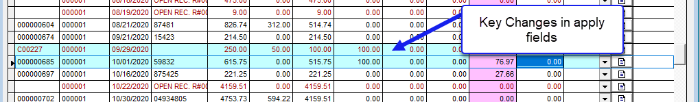 6. The user can enter the credit amount in the 'Apply' field of the Credit Memo and the same amount in the 'Apply' field of the corresponding Invoice if the total amount of the credit memo will not be applied. The user has the option to apply the Credit memo to multiple invoices. The rows will automatically display in blue as the user enters the amounts in the apply field. This method allows the user to apply a partial Credit Memo to an Invoice.