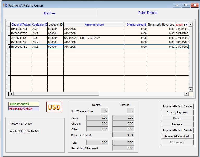 The amount in the batch details will display as zero upon closing the Payment/Refund Center Screen.