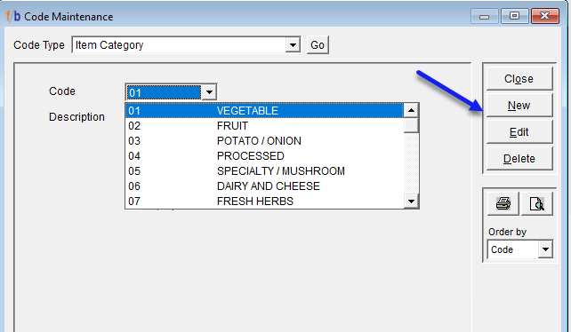File-> Code Maintenance -> Select from the drop-down list and select Item Category. Select ‘Go’ and then Select ‘New’.