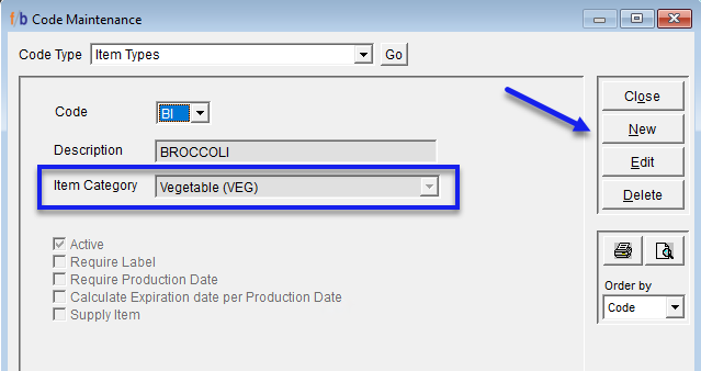 All Inventory Items must be associated with an Item Category. The Company must set up Item Categories in Code Maintenance before attempting to create Inventory Items. ‘Item Categories’ identify major classifications of your inventory types and are used primarily for reporting. Item Categories allow you to group like items (e.g. "Vegetables", "Meat") on system reports.