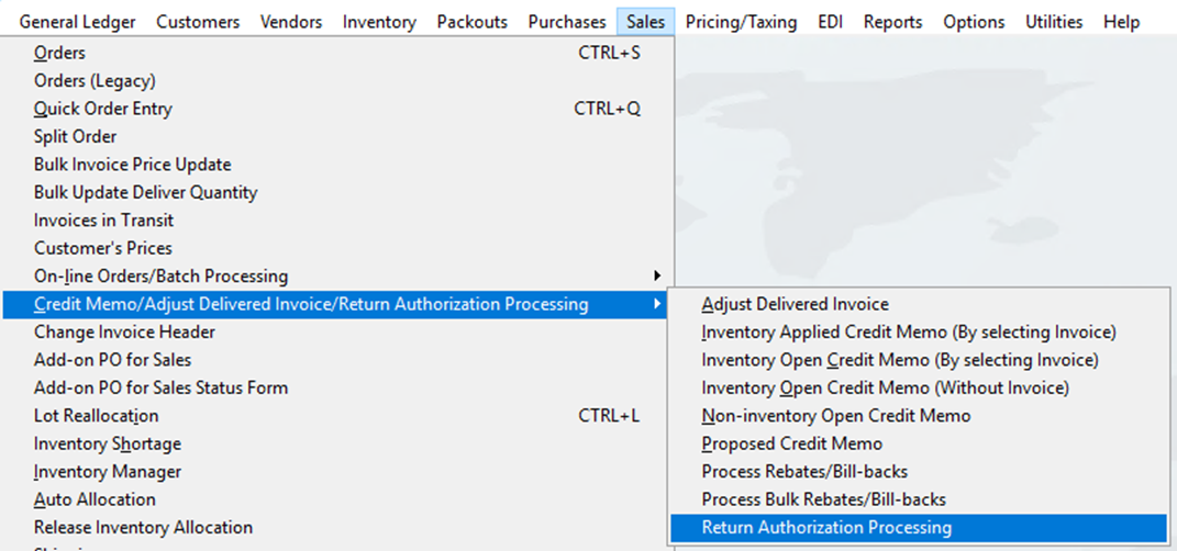 Sales -> Credit Memo Adjust Delivered Invoice/Return Authorization Processing -> Return Authorization Processing