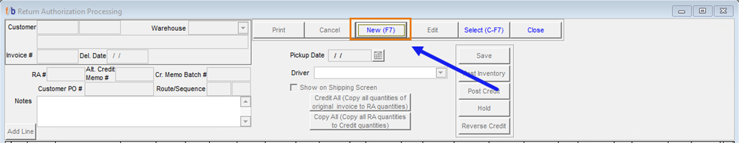 Select ‘NEW’ or F7 to create a new Return Authorization.