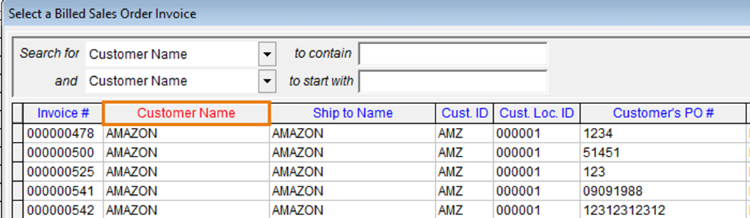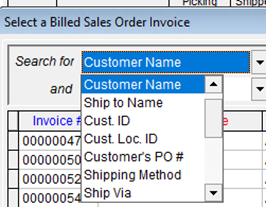 FreshByte will automatically display the' Select a Billed Sales Order Invoice' lookup menu, and the system defaults to the 'Invoice Number' field.
