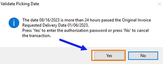 After selecting the invoice, FreshByte will display a 'Validate Picking Date' message if the selected invoice was billed over 24 hours ago. To proceed with the return, simply click 'Yes' to clear the message. No password is required from the user.