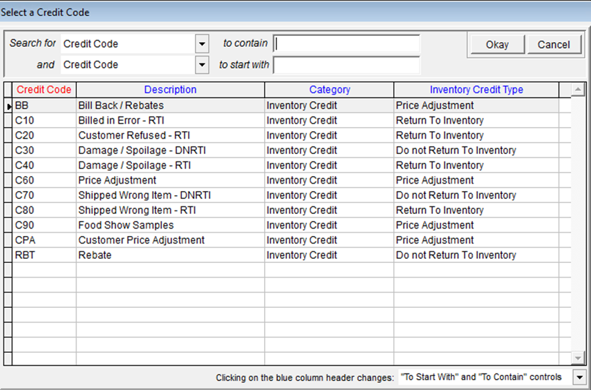 Enter the quantity of the return (credit) in the RA Quantity field. FreshByte will automatically present the 'Select a Credit Code' screen, which displays a list of Credit Reason Codes. Select the appropriate Credit Reason Code and click 'Okay'. If there are multiple items being credited, repeat these steps.