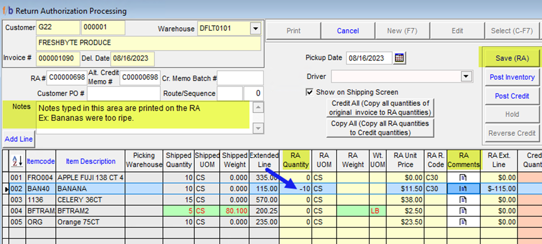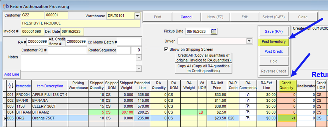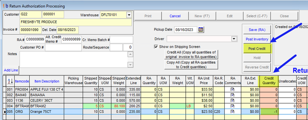 Note: FreshByte will add the Line Item again, but the User will be restricted to only crediting a quantity equal to or less than the original ‘Shipped’ Quantity.